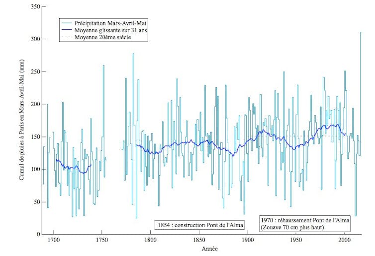 La variabilité et l’évolution des pluies au nord de la France a récemment été analysée par Bastien Dieppois et ses co-auteurs, dans une étude publiée en 2016 et portant sur plusieurs siècles de données historiques, remontant en 1688. Elle montre une forte variabilité sur plusieurs dizaines d’années (en relation avec la variabilité des températures à la surface de l’océan Atlantique qui affecte la circulation atmosphérique), et une tendance significative à l’augmentation des pluies printanières.