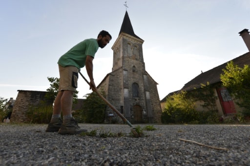 Guillaume Claude, le jardinier en chef du village Saint-Pierre-de-Frugie enlève les mauvaises herbes devant l’église, le 12 septembre 2016.